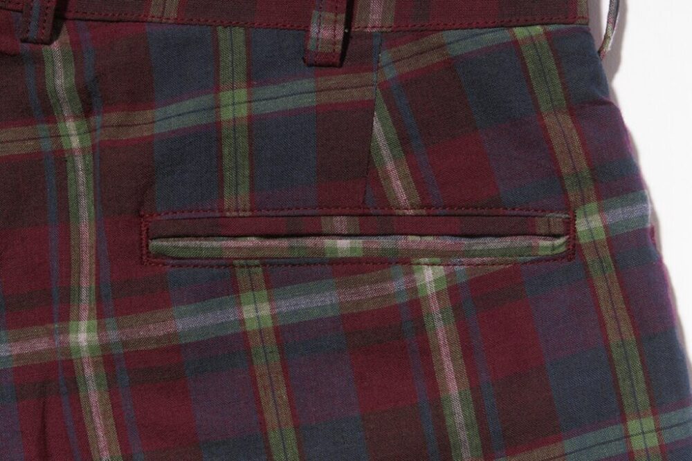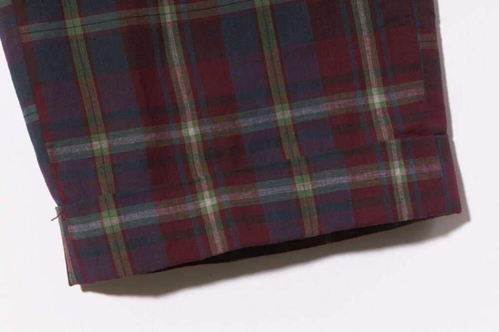 ダブル仕上げの裾幅はスタンダードな4mm幅。マドラスというカジュアル感の強いテキスタイルを品よく見せてくれる。生地が軽やかなので、ここからさらにロールアップしても重くならずにくるぶしを見せることができる。