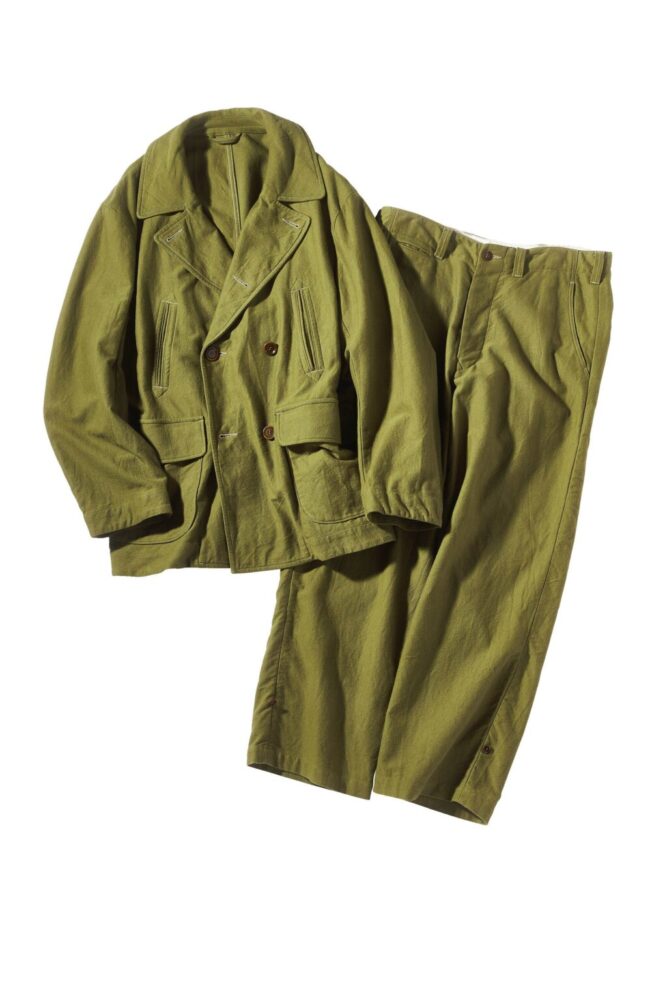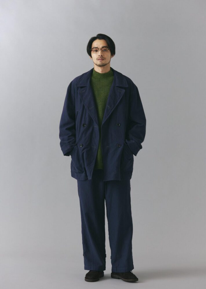 上下ともに1940年代にUSネイビーやUSマリンコープにて採用されたミリタリーアイテムをイメージソースとしつつも、よりリラックス感のある現代的なシルエットに再構築。ドビー織りの生地を揉み込むように染め上げ、手触りだけでなく視覚的にも柔らかな膨らみを感じる風合いに仕上げた。ピーコート5万3900円、パンツ2万9700円