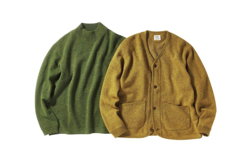 英国産シェットランドウールとファインメリノウールを裏毛スウェット感覚でマットな表情に編み上げたオリジナル生地を使用。カーディガンはチェコ軍の60年代製ミリタリーライナー、セーターはUSアーミーの50年代製のものがイメージソースとなっている。セーター3万1900円、カーディガン3万9600円