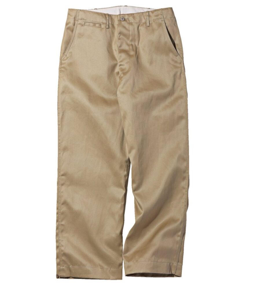 一見普遍的な45カーキ。だが、これは上級士官のために作られたモデルをベースにしている。まずは、この生地に注目。超がつくほどの高密度のコットンツイルを使用することで、見惚れるほどの光沢感を放つ。また、ノータックながら限界まで太さを担保したシルエットも新鮮。またとない特別なチノに仕上がった。3万9600円(クローチア03-6455-0548 http://clothier.tokyo)