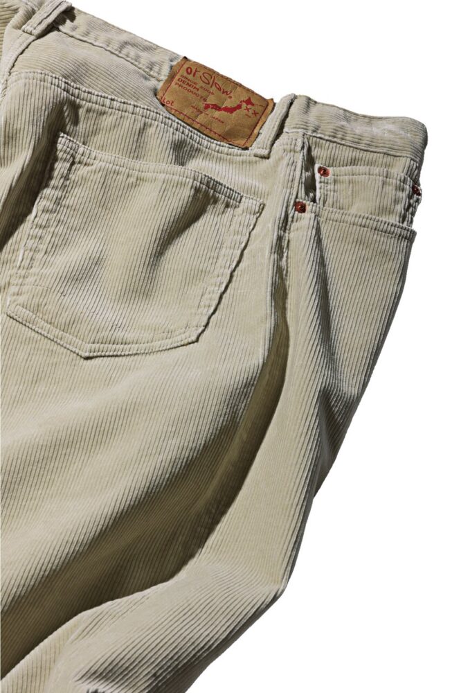 まず[101 ダッズフィット デニムパンツ]というモデル名に着目。その名の通り「アメリカの田舎のお父さんが穿いていそうなパンツ」というコンセプトが面白い。裾に向かって緩やかにテーパードしたゆったりシルエットがなんとも90sな雰囲気。イナタさ全開で穿きこなしたい。アイボリーのコーデュロイ生地に加えて、ブラック&ブルーデニムも展開。2万5300円(ベースデニムプロダクツ0798-74-8106 http://orslow.jp)