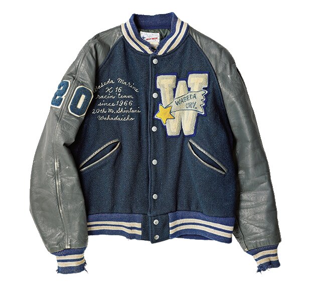 伝説の名店バックドロップで作ったバトウィンのスタジャン。ヨット部時代の愛称である“WAKADAISHO”の刺繍が!