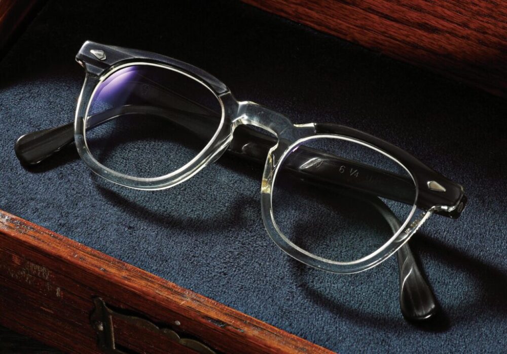 1960年代に大流行したセルフレームのなかでも洗練されたクラシックな印象のウェリントンシェイプ。写真はアイビーのアイコン、ジョン・F・ケネディも愛用していた〈アメリカンオプティカル〉の[サラトガ]。AO、シュロン、ボシュロムはアメリカ3大アイウエアメーカーと称される。