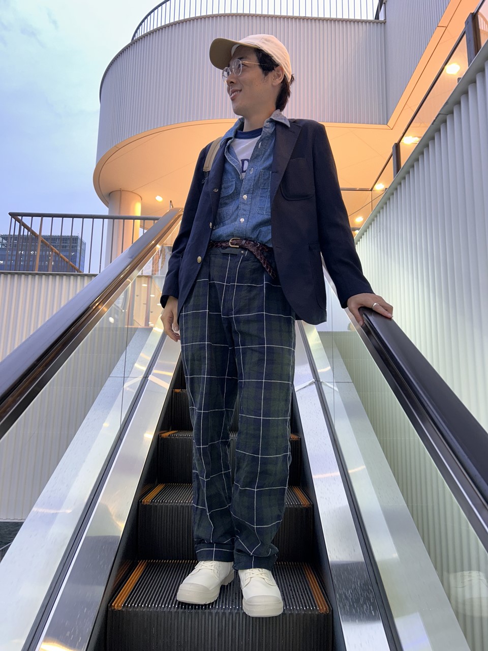 3人の中では最年長のパピー高野は王道のブレザースタイル。タータンチェックのパンツに足元にはシンプルなオフホワイトをチョイス。足元を白にすることで全体が軽やかな印象に。「真っ白ではなく、オフホワイトなので綺麗に見えすぎないところがトラッドなスタイルとも合わせやすいです。サイドジップがあって着脱しやすいのも嬉しいポイントです」。