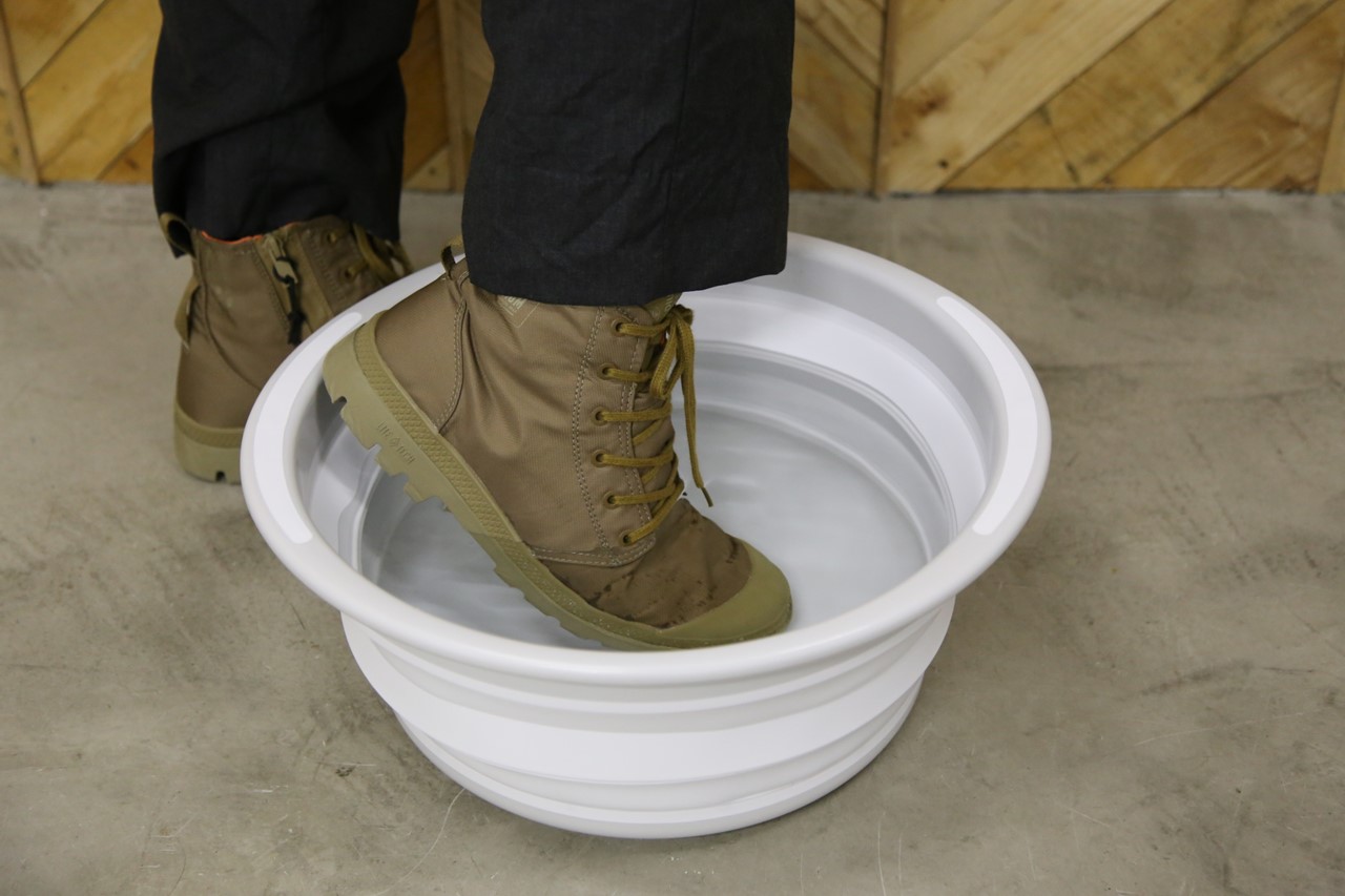 シンプルにたらいに水を張り、躊躇なく足を入れて約1分間、その状態をキープ。さすがに水は入ってくるだろうという編集部の予想とは裏腹に全く浸水がなかった模様。実験台となったナマタメは「本当に入ってこない。びっくりです!」と驚きの表情を見せた。
