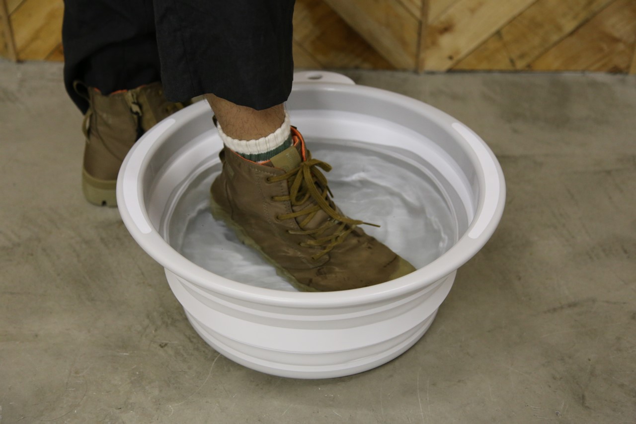 横浜での散策中は、小雨が降った程度で十分に[PAMPA HI SEEKER LITE+ WP+]の防水性を確かめることができなかった。そこで後日、その防水性を実証するべく、同モデルを履いた状態で足を水に突っ込むという大胆な実験を行ってみた。