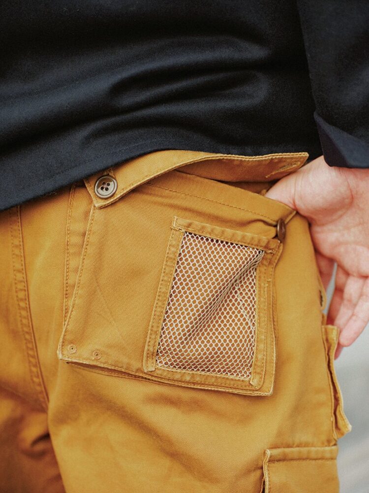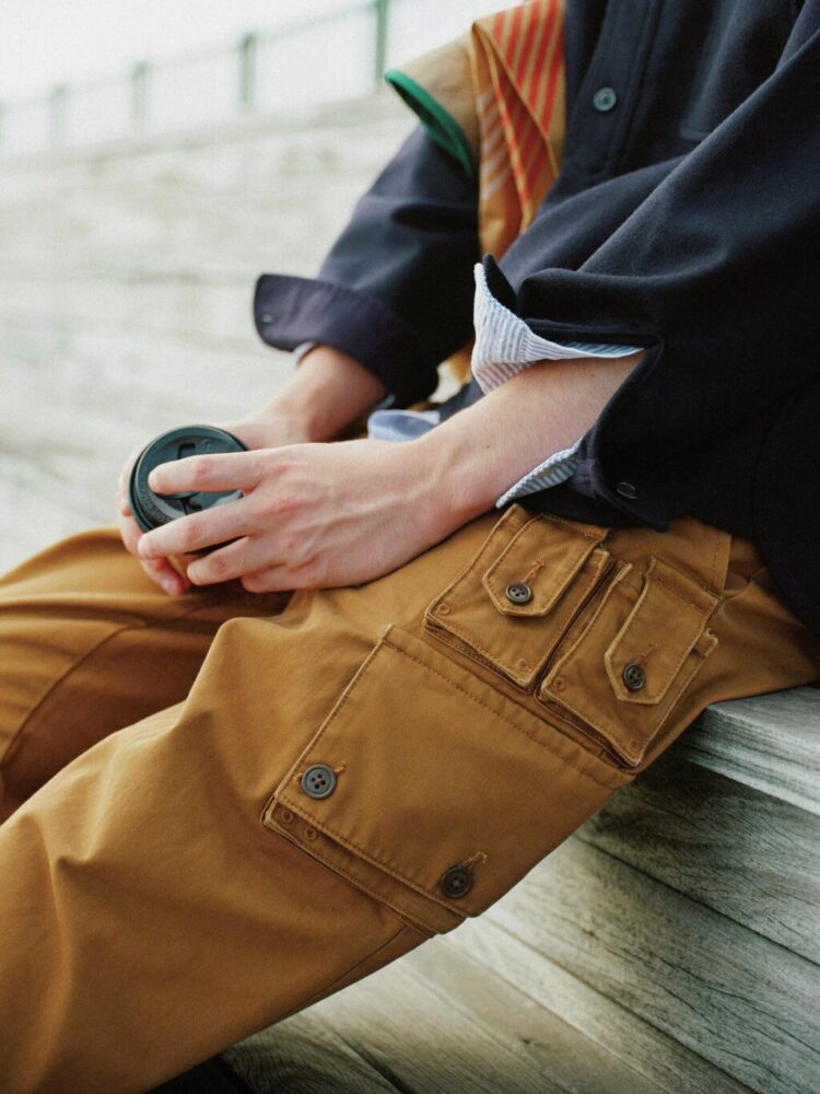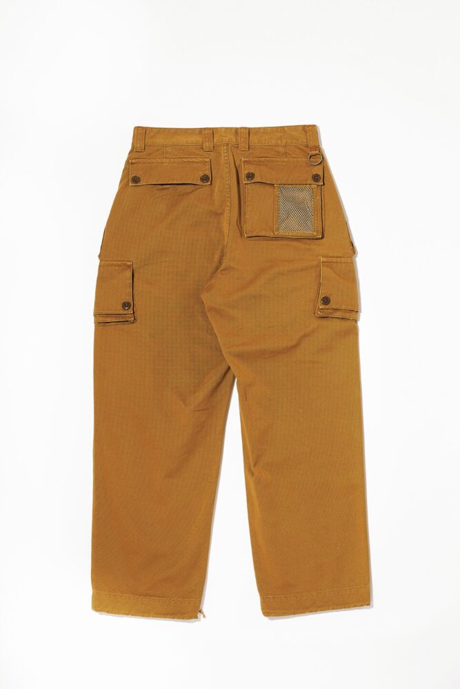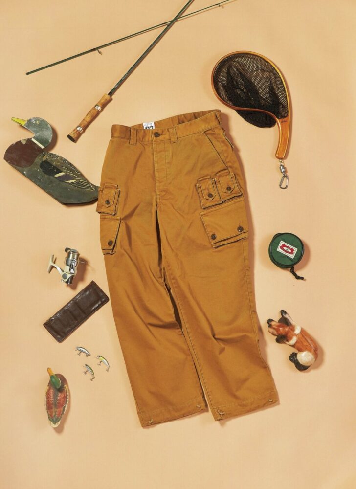 ウエブでふと目を留めたとあるパンツには、腰回りにフィッシングベストのようなポケットが付いていた。フィッシングパンツと説明されていたが、実物を確認したくなって、1年以上にわたり古着店を探し回ったが、いまだに見つからず。それならば作ってしまえと私利私欲まみれで企画がスタートした。製作を依頼した〈ジプシー&サンズ〉にサンプルとして保管してあった希少なヴィンテージのフィッシングベストのディテールを移植。元ネタの希少さもさることながら、一からイメージして作ったこちらは、似たものすら見つからない貴重なパンツと言えるだろう。