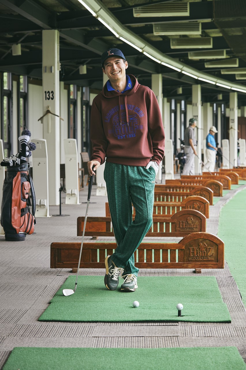 コットンポリ素材でクラシックなルックスを保ちつつ、軽量で速乾性に優れたアイテムも豊富。ゴルフモチーフで落ち着いた色味のフーディーや、さりげないモノグラム柄とセンタークリースで上品に仕上げたトラックパンツなど、ゴルフに必要なウエアやアクセサリーがラコステならトータルで揃う。フーディー2万5300円、長袖ゴルフポロシャツ2万2000円、トラックパンツ2万4200円、キャップ 7700円、シューズ1万9800円/すべてラコステ