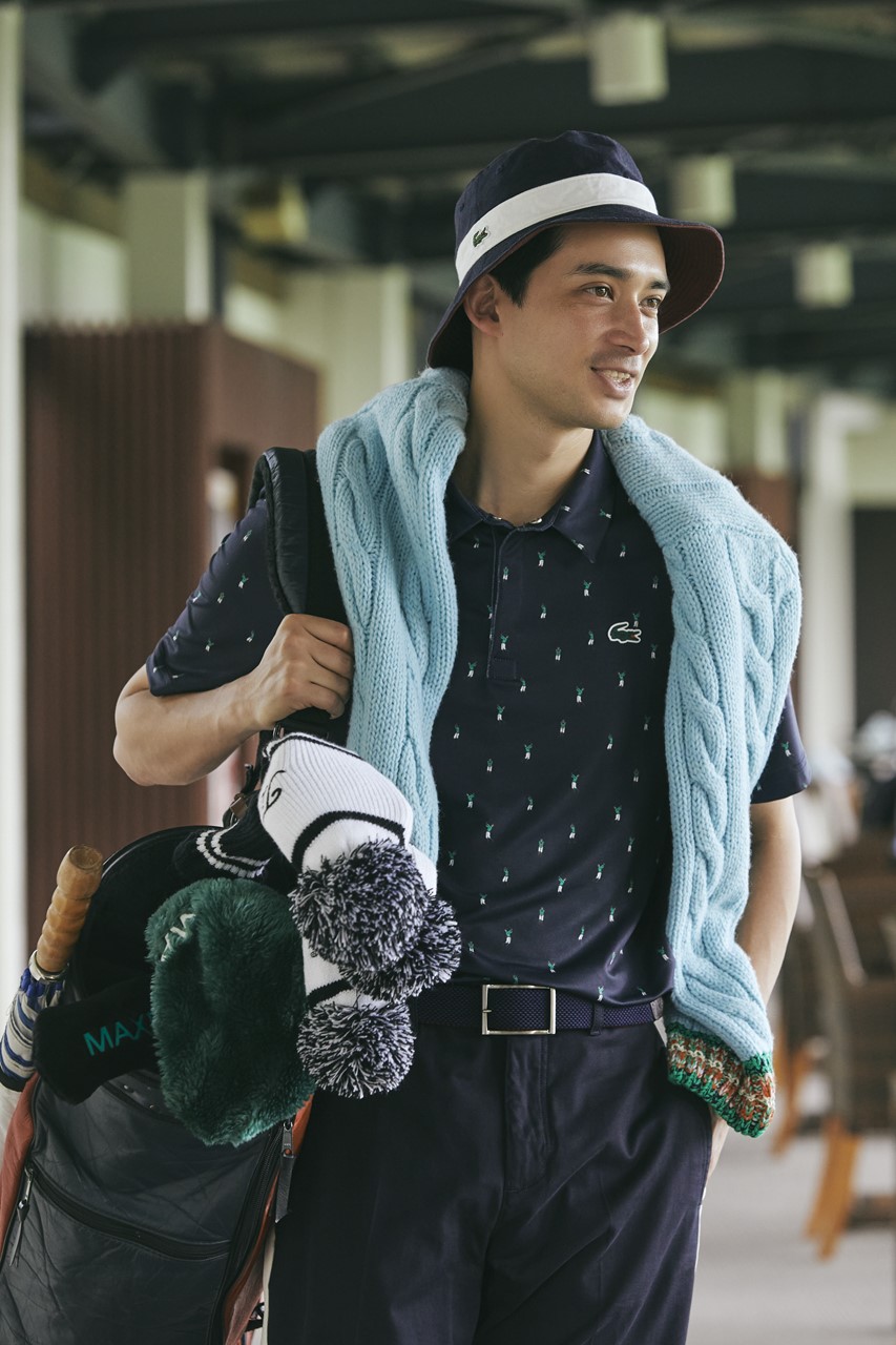 ラコワニを生んだアーティスト、ロベール・ジョルジュがかつてデザインしたゴルフを愉しむ紳士のイラストを小紋柄でポロシャツにアップデート。SPF50のUVカットを備えたハイストレッチ&ウルトラドライ素材でプレー時もストレスフリー。ポロシャツ1万7600円、肩に掛けたニット3万4100円、ハット1万1000円、パンツ2万2000円/すべてラコステ
