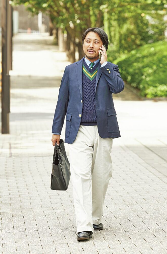 アメトラの中でも得意というブレザースタイルでこの日は新卒説明会へ。一見シンプルなベストはパッチワーク調になったお気に入り。セメントカラーの太パンで軽快さをプラスしている。「未来の後輩たちの緊張を解こうと軽くボケたのですが、完全に不発でした(笑)」ニットベスト1万6500円/ビームス プラス(ビームス プラス 原宿)、その他私物