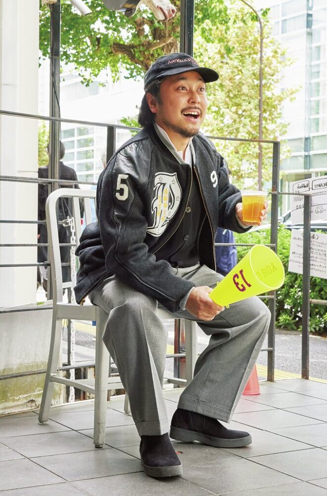 仕事終わりにお気に入りのスタジャンを羽織って、野球観戦へ。モノトーンでまとめモダンなスタイルを意識。「父と母の応援する球団が違うので、幼少期は肩身が狭かったです(笑)。いまは神宮球場で好きな球団をのびのび応援しています」ポロシャツ1万7600円/ケネスフィールド、パンツ2万8600円/ビームス プラス、ブーツ4万9500円/サンダース(すべてビームス プラス 原宿)、その他私物