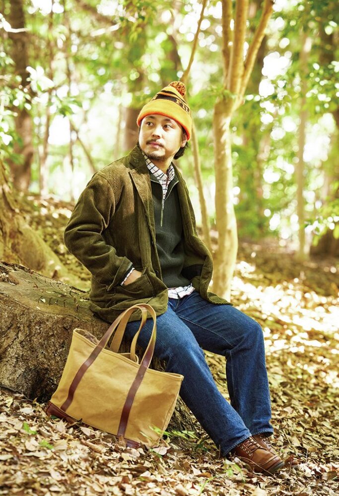 森林浴をしたい時は長年愛用しているラッセルモカシンのブーツを中心にコーディネイト。「フィールドに出る時ももちろんベースはアメトラです。だけどちょっとした機能性を落とし込むなどTPOは常に意識しています」ジャケット5万9400円/エンジニアド ガーメンツ、シャツ1万5400円/ビームス プラス、ハーフジップニット3万5200円/バトナー×ビームス プラス、バッグ4万2900円/アーツ&クラフツ(すべてビームス プラス 原宿)、その他私物
