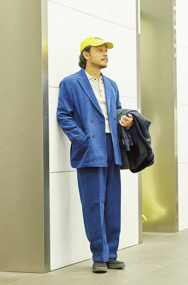 フレッシュな印象を残す共地のセットアップを中心に、ニットポロとコートを合わせた商談スタイル。「先方に失礼がないよう、きちんとした印象を持たせつつ、ツッコまれたい一心でイエローのキャップを被りました」ジャケット4万6200円、ニットポロ1万6500円、パンツ3万5200円、手に持ったコート8万2500円/すべてビームス プラス(すべてビームス プラス 原宿)、その他私物