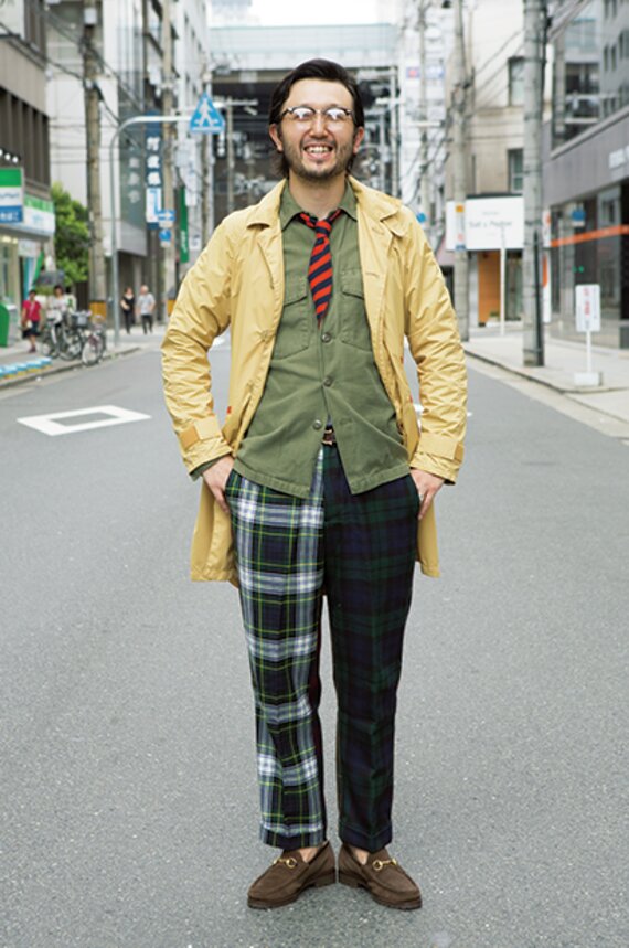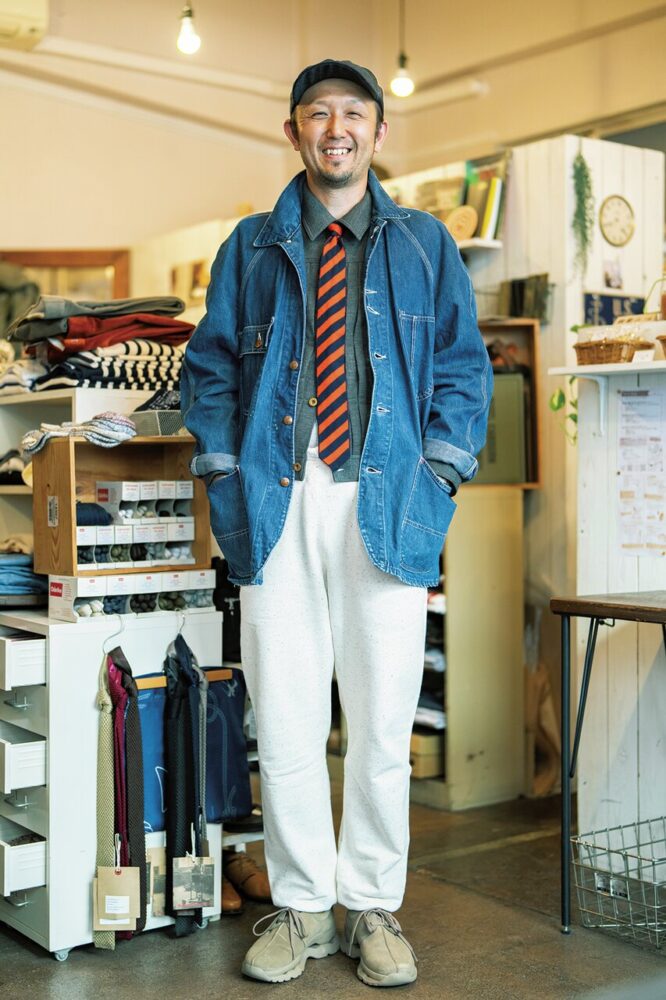 「過去のスナップも振り返りつつ、昔から愛用しているものと今の気分で着たいものでコーディネイトを組みました」と、2012年のスナップでも着用していたニットタイを使いつつ、ヴィンテージのカバーオールでまとめたミックススタイル。