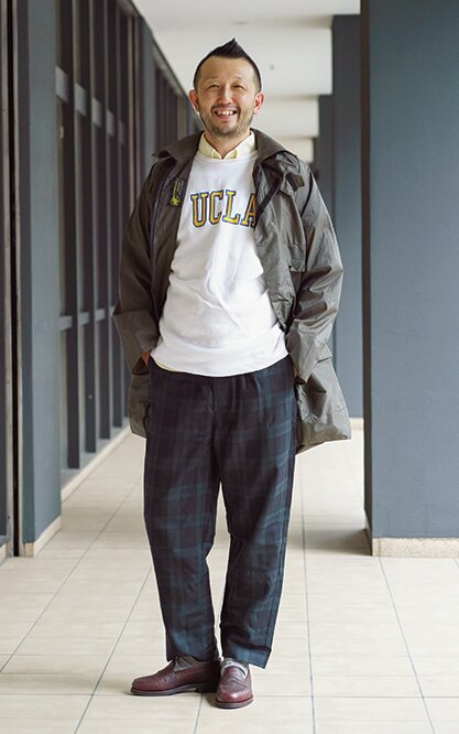 「原点回帰して、UCLAのスウェット、BDシャツにブラックウォッチのトラウザース。2ndっぽいスタイルだと思います」