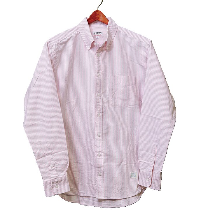 1929年創業のアメリカの老舗の定番シャツにピンクのキャンディーストライプをリクエスト。ハリの良いオックスフォード地を使用している。セロ×キャシディホームグロウンのBDシャツ1万4300円
