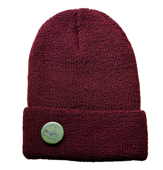エンジニアドガーメンツのニットキャップはウール100%で深めのデザイン。バーガンディに加えてオリーブ、レッドなど全5色展開。缶バッジ付きなのも嬉しいポイントだ。5500円