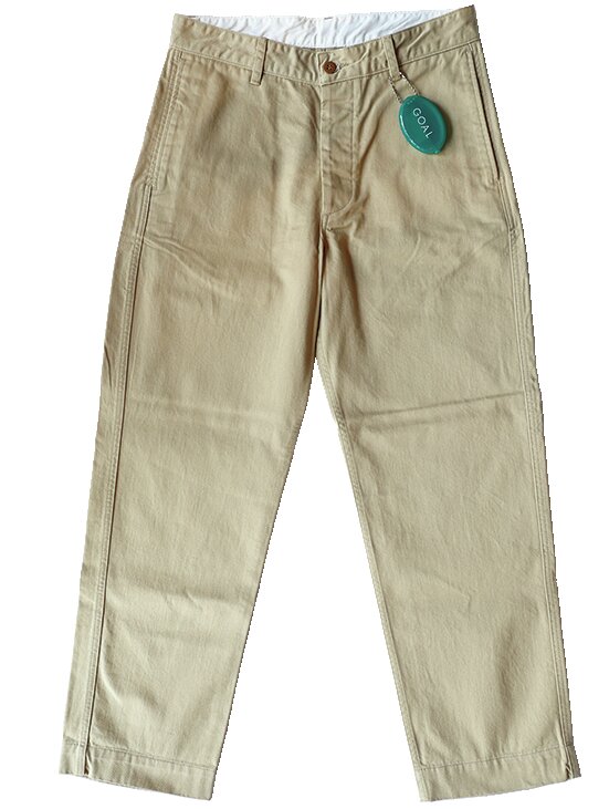 米軍のチノパンツを初めて手がけたとされるギャリー&ロード社製の80sデッドストック生地を使用したゴールのチノパン。もちろんメイド・イン・USA。1万7380円