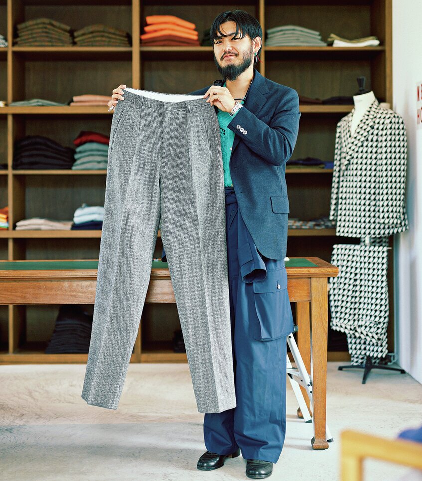 ニートのヴィンテージのレディススラックスを着想に腰割りをワンプリーツ+玉縁ポケットでシャープな印象にまとめた。ウールヘリンボーン仕様のトラウザーズ。4万9500円