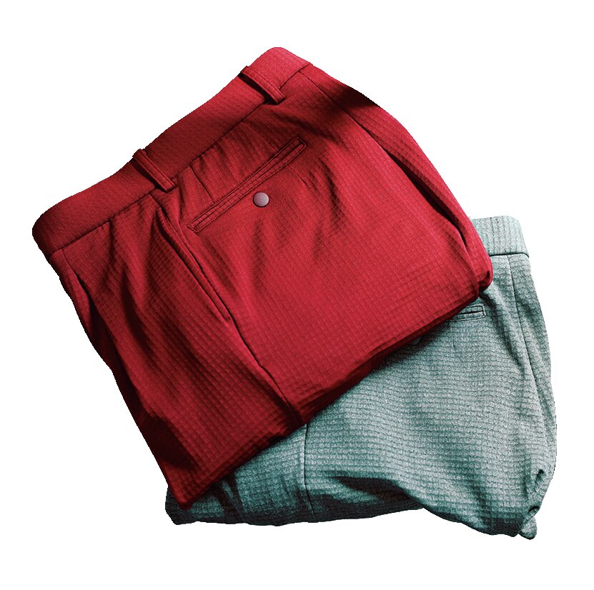 ドレス由来の2プリーツスラックスをアウドドアアパレルでお馴染みの凹凸あるポーラテックパワーグリッド素材で仕上げたハイパフォーマンスモデル。ニートのポーラテックパンツ各3万5200円
