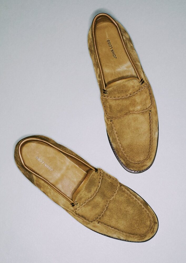 サイドとエプロンに施されたハンドステッチが特徴的。柔らかなスウェードをアンライニングで仕上げ、グッドイヤーウェルト製法ながら薄くて反りのいいソールが心地よい。25万800円(ジョン ロブ ジャパンTEL03-6267-6010)