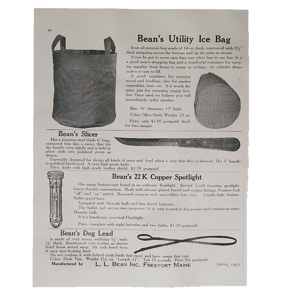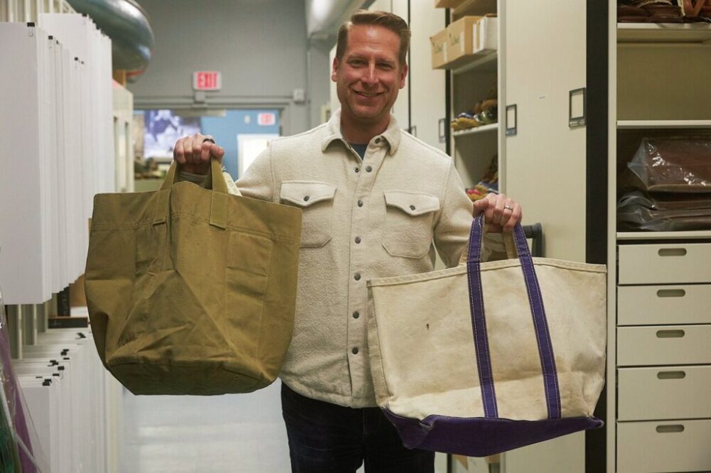 1944年に氷の運搬用として登場したビーン・トート。発売当初はかなり武骨なデザインだったことがわかる。右のバッグは70年代製でネイビーカラーがパープルに経年変化している。