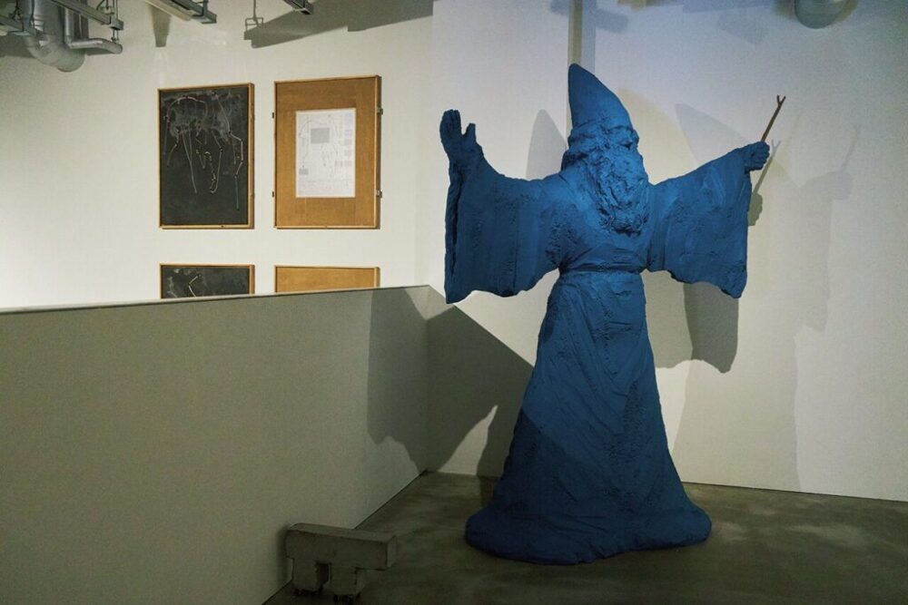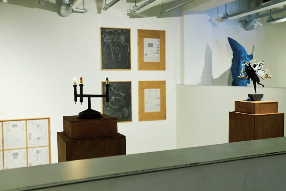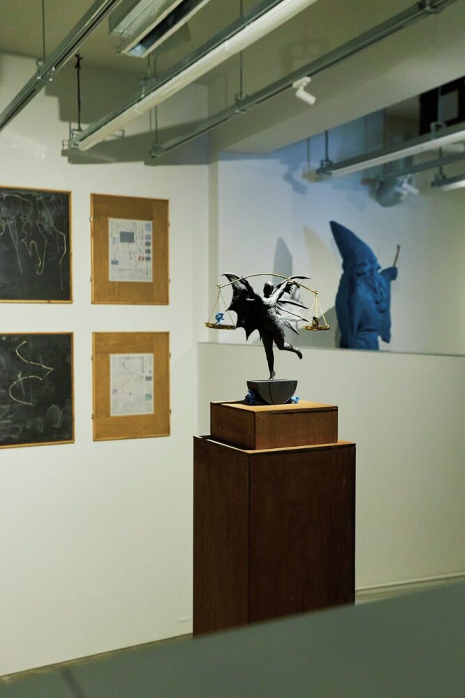 コウモリ人間を象ったオブジェクトは、ゲームの装置に含まれるパーツのひとつ。1835年にアメリカで起こった捏造事件から発想された。この配置もサイコロの出目によって決められているが、2階建ての特徴的なギャラリー空間を考慮し、上階から見た際の目線にあわせて、壁の作品や立体作品の高さを設定したという。