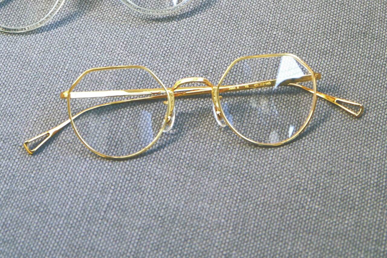 シートメタルをくり抜き、折り曲げ、接着させることで成形するフレーム技術の精巧さは、ついため息が漏れるほど。バーブリッジ風の2ブリッジも楽しいデザイン。「ラインが際立つような作りが素晴らしく、玉型も小振りなため日常でも使いやすいですね」(店長・志岐さん)。