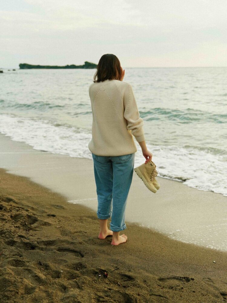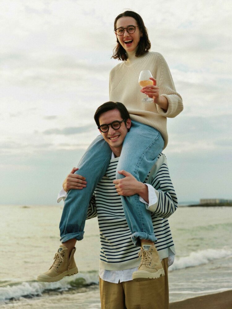 フランスを連想させるもの。ラフにロールアップしたアイスブルーのデニムパンツ。ざっくりと編まれたフィッシャーマンズセーター。ぶかぶかのボーダーのバスクシャツ。砂まじりのキャンバススニーカー。夏の終わりの夕暮れと海辺になぜだかフランスを感じてしまうのはエリック・ロメールの映画のせいか。スニーカー1万4300円/パラディウム(S-Rush 原宿店TEL03-6455-4125 )