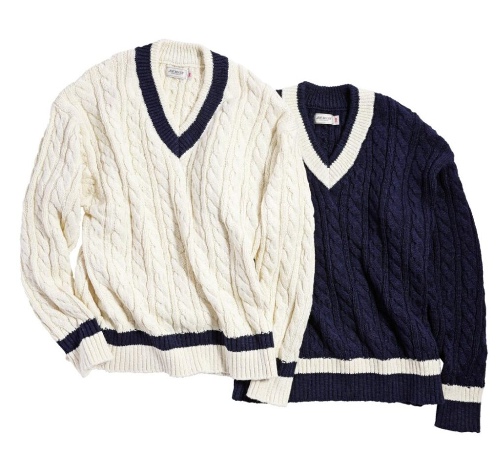 アイビーやプレッピースタイルの定番として欠かせないクリケットセーターの出自ははその名の通り、クリケットのプレー時にラインの色や本数でチームを識別するため。およそ100年前のスタイルを再現した1枚は、不均一なスラブコットンにより風合いがよく、立体的に仕上げられたケーブル編みが1枚で着ても十分な存在感を醸す。各4万6200円(ザ・リアルマッコイズ東京 03-6427-4300 https://therealmccoys.jp/brand.html/3)
