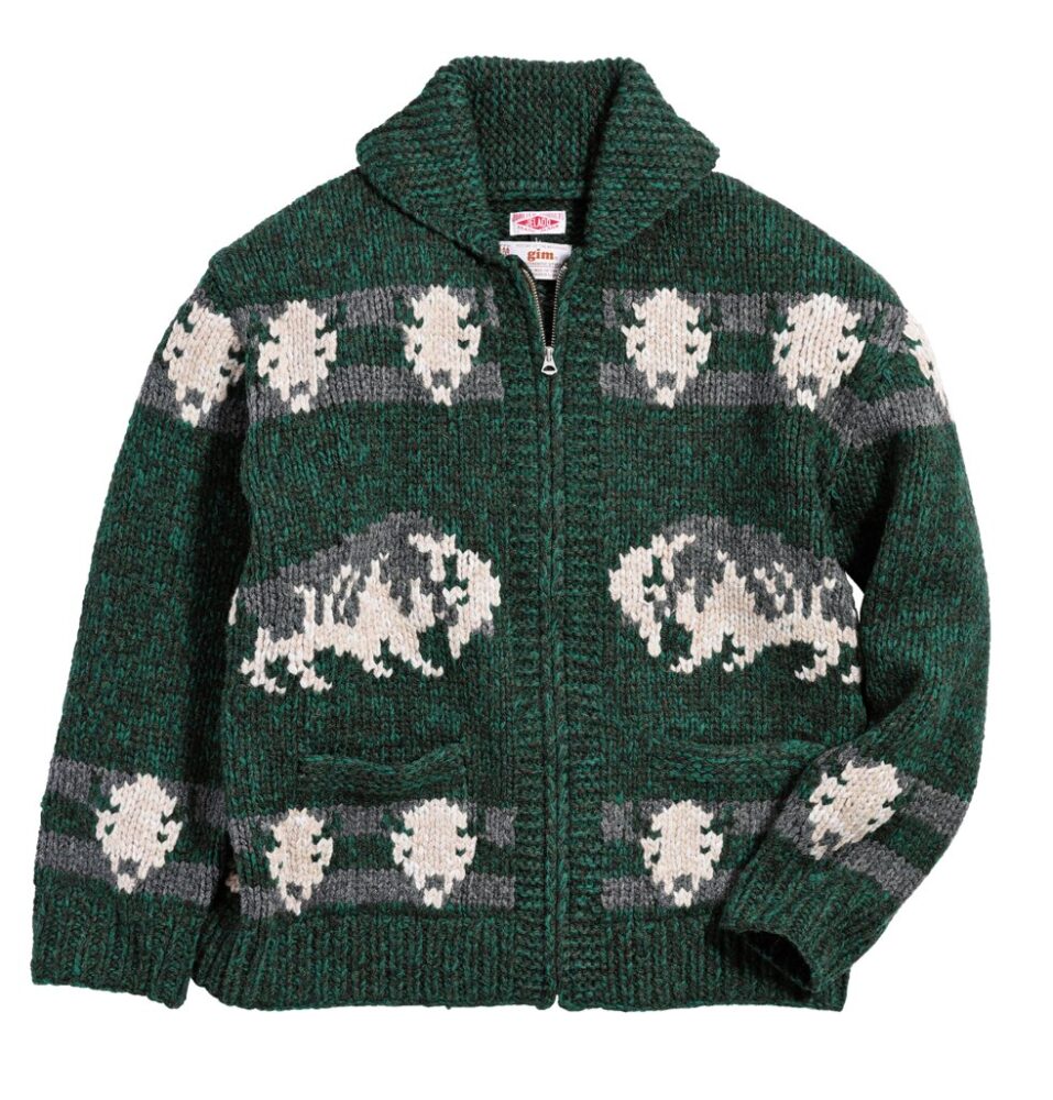 カナダ・バンクーバーの先住民族「カウチン族」伝統のニットは、カウチンニットとしてファッションピースとしても定着。ジェラード初のハンドニットはこのカウチンニットをgimが持つ生産背景を使うことで製作。未脱脂の羊毛を使った荒々しく重量感のあるカウチンには、ヴィンテージではなかなかお目にかかれないバイソン柄。8万8000円(ジェラード フラッグシップストア 03-3464-0557 https://jelado.com/)