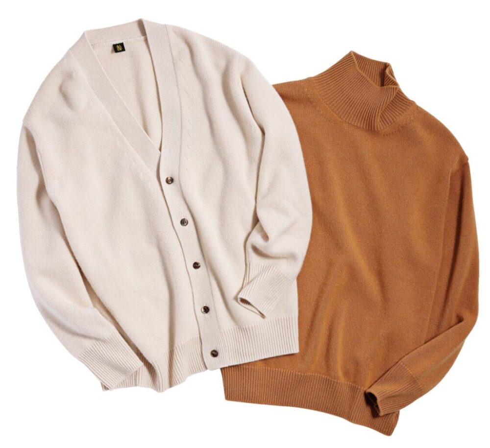 越冬前のベビーカシミヤ1頭からわずか10gしか採取できない貴重な部位の産毛のみを使用した逸品。滑らかな風合いと、綿毛に優しく包まれるような軽さで、卓越したこのカシミヤならではの暖かさと心地よさを感じることができる。タートルネックとカーディガンタイプが展開されており、どちらも着込むほどに風合い豊かに育ち、その姿は文字通り格別だ。各11万円(マッハ55リミテッド 03-6434-7007 www.batoner.com/)