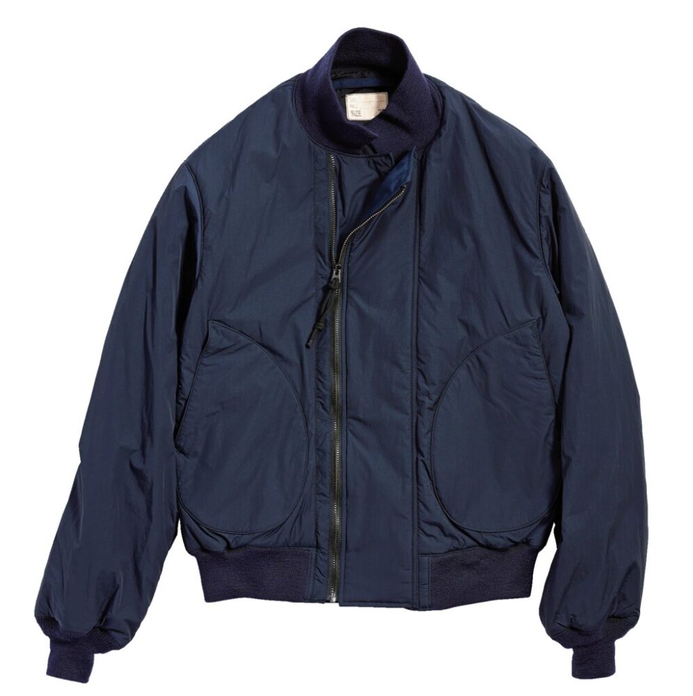 U.SネイビーのデッキフックとU.S.AエアフォースのB-15フライトジャケットを巧みにミックスした完全オリジナル。ヴィンテージライクな見た目に、隠しポケットやブラスジップなどのディテールも。また保温力を高める断熱素材クライマシールドを内蔵するなど機能的な仕上がりに。4万1800円(東洋エンタープライズ 03-3632-2321 www.toyo-enterprise.co.jp/)