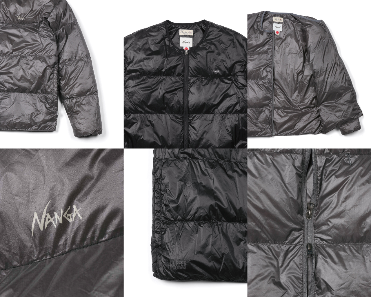撥水性があり、摩擦強度が高く、滑らかでシワになりにくい、汚れが落ちやすいイージーケアなリップストップナイロンを採用。ダウンジャケット同様に、中綿のダウンは、NANGA の「Re: ACT 」ダウンを使用している。