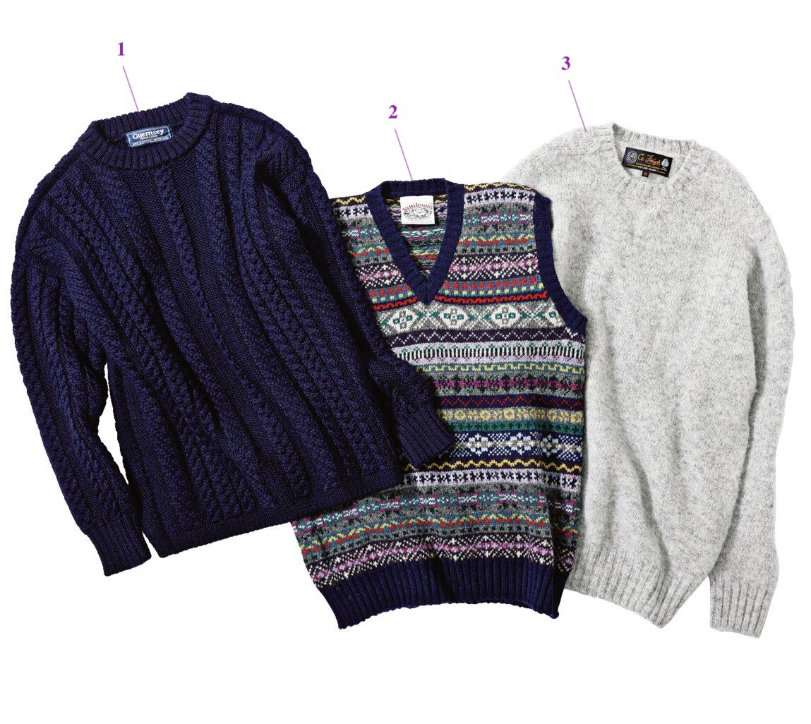 1.【アラン】漁師が防寒用として着ていたフィッシャーマンセーターの元祖。アラン諸島で生まれたことに由来する。2万4200円/ガンジーウーレンズ(ブリティッシュメイド 銀座店TEL03-6263-9955)