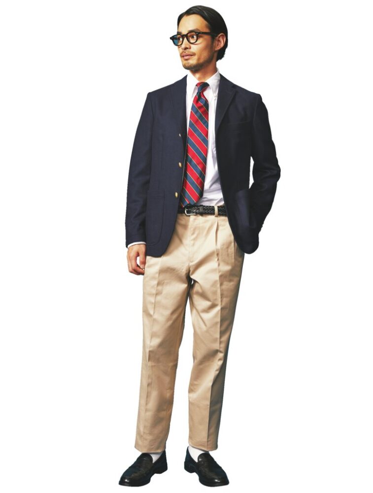 クラシックな英国スタイルを合わせていく場合も、あくまでベースはアイビースタイル! このコーデが基本だ。ネイビーブレザー5万6430円、チノパンツ1万9800円/ともにPt.アルフレッド(Pt.アルフレッドTEL03-3477-7952)、BDシャツ2万8600円/インディビジュアライズドシャツ(ユーソニアン グッズ ストアTEL03-5410-1776)、タイ1万4300円/ベントレー クラバッツ(メインTEL03-3264-3738)、メガネ4万5100円/ジュリアス・タート・オプティカル(コンティニュエTEL03-3792-8978)、ローファー18万8100円(ラコタTEL03-3545-3322)
