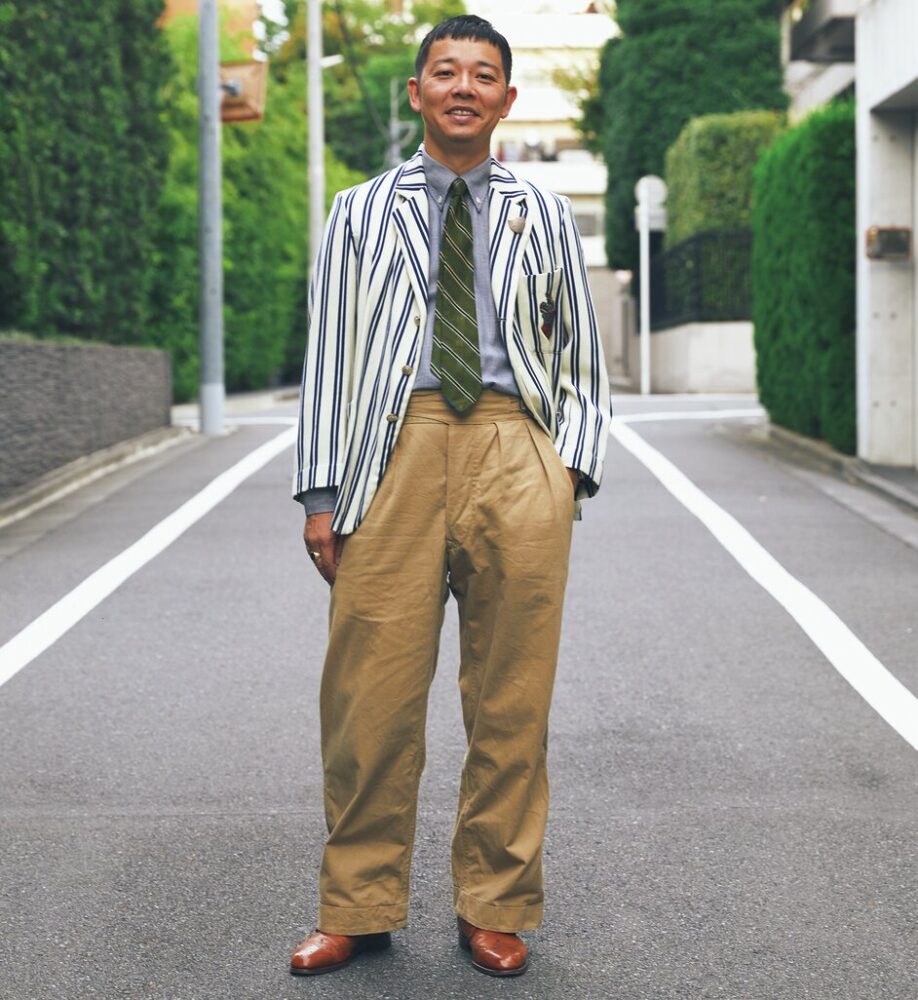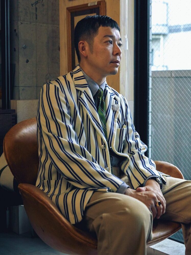 「アイビーに英国モノをミックスすることは普通といえば普通なのであまり考えたことがありませんでしたが、改めて考えてみると、すごく面白いなと思いました。アイビーには『カレッジ』というテイストが入ってくると思うので、英国の要素は強くしつつも、そこはブラさずに残すように意識しました」と英国の左胸の校章がついたカレッジジャケットを中心に、レジメンタルタイやグルカパンツを合わせてコーディネイト。