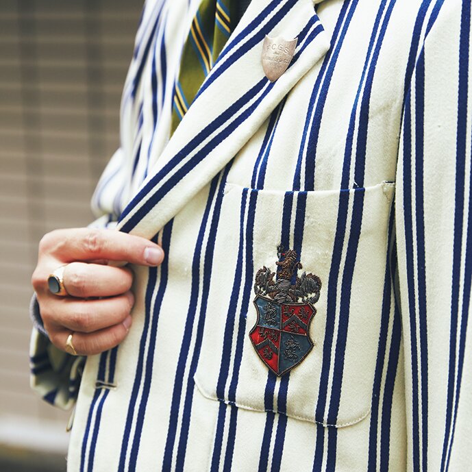 今年の春にオーダーし、8月に届いたというサヴィルロウ最古のテーラーでビスポークした思い入れのあるブレザー。上質な生地からは高級感が漂い、着用した際のイングリッシュドレープからは紳士の余裕が感じられる。左胸のチーフもヘンリープールのもの。