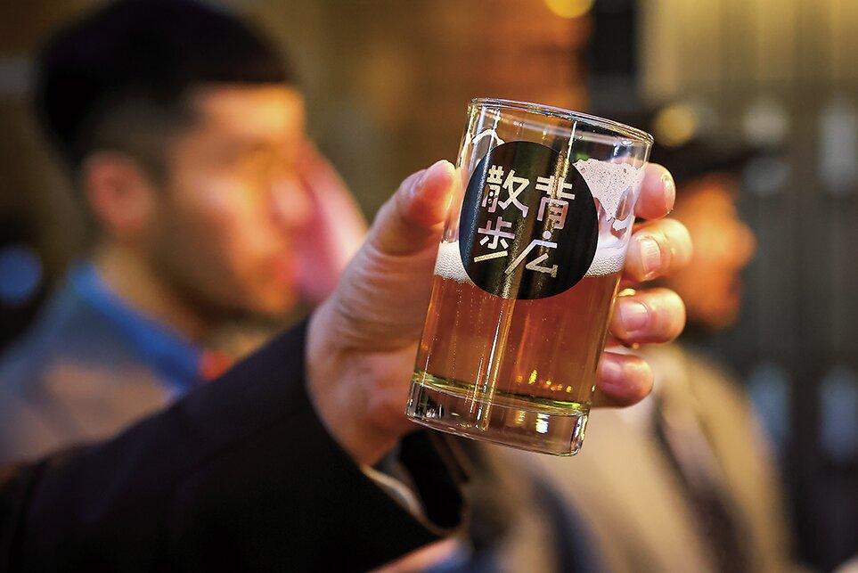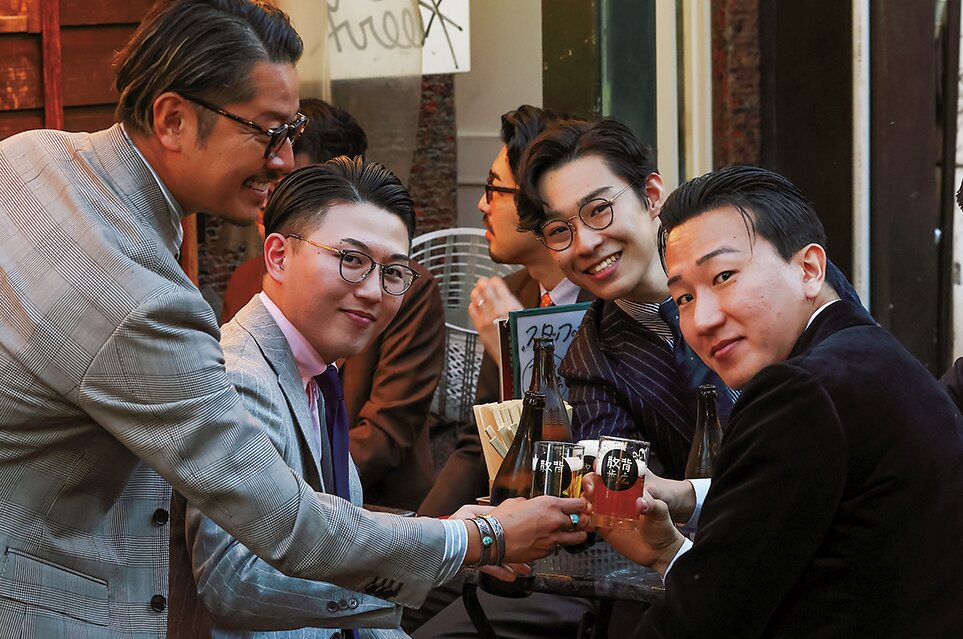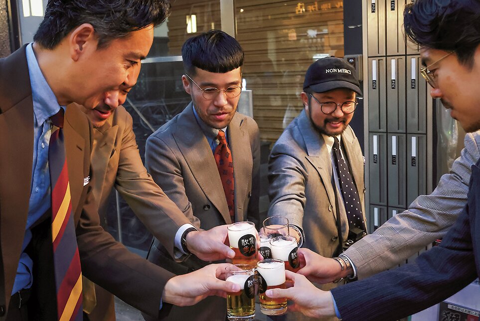 途中で記念撮影を挟みつつ、ネイビー、グレー、ベージュとスーツのカラーに合わせて部隊を分けるなどの試みもあり、参加者は笑顔で“背広談義”に花を咲かせた。夜はホッピー通りで自由参加の懇親会を開催。参加者にプレゼントされた背広散歩オリジナルのグラスで乾杯した。第1回目の開催にして大盛況となった今回のオフ会。背広散歩の今後の活動から目が離せない。