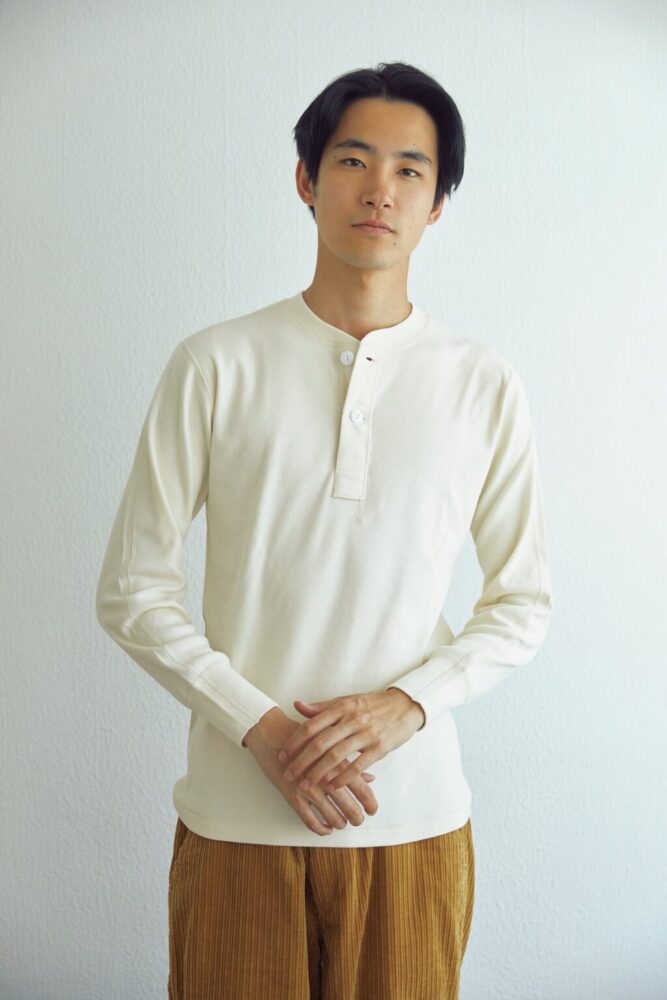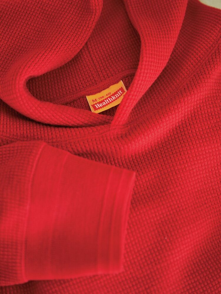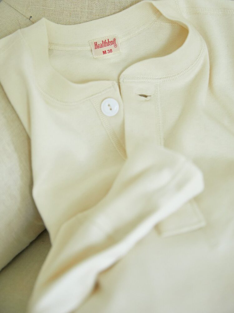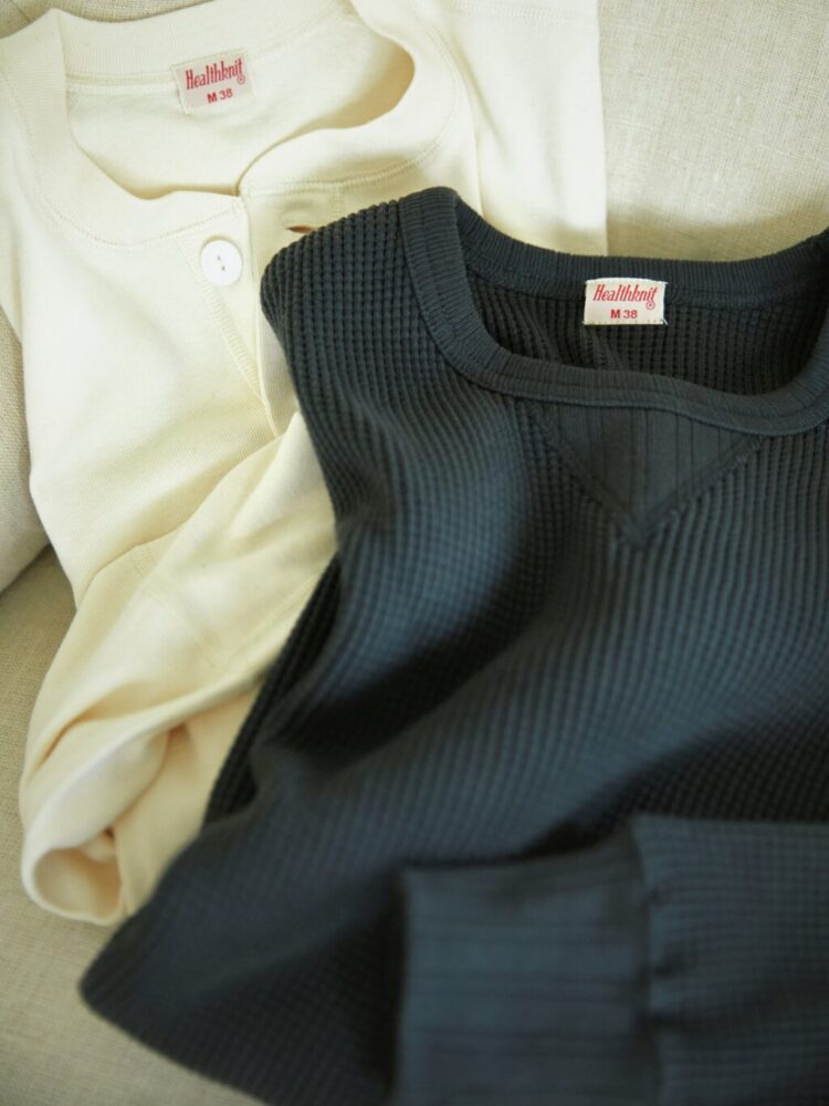 なかでも「ヘルスニット」は前立てに3つボタンを配した、いわゆるヘンリーネックを開発したメーカーとして広く知られることに。高級下着にも採用される4本針フラットシーマの縫製は凹凸が少なく、厚みのあるネックはくたびれにくいと、当時のワーカーから絶大な人気を獲得した。