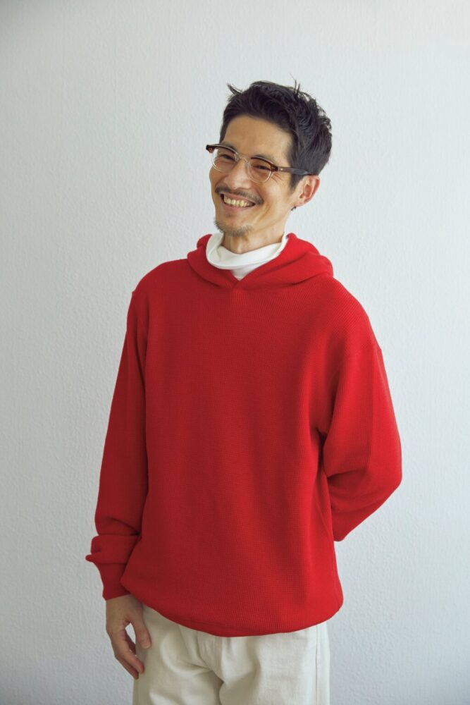 滑らかな肌触りの100%ウールをワッフルで編み立て、フーディー仕様に。ゆとりのあるフィッティングなので、一枚で着てもサマになる。ウォッシャブル加工を施しているので洗濯機洗いも可能。3万8280円