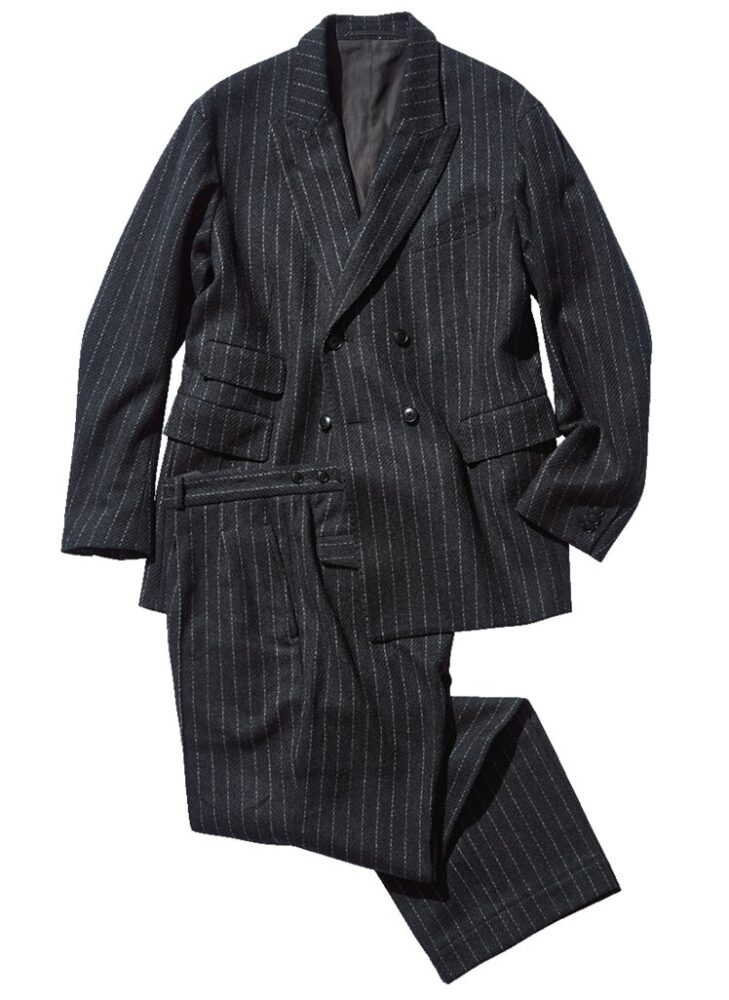 20年代頃の芸術家やジャズマンのユニフォームからインスパイア。チョークストライプを表現したカシミヤ混オリジナルツイードは、梳毛と紡毛の混織で優しい肌触り。ジャケット8万8000円、パンツ5万5000円(オールドジョー フラッグシップストアTEL03-5738-7292)