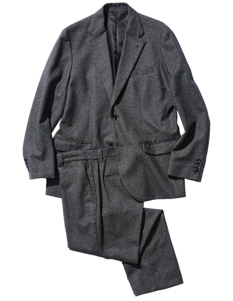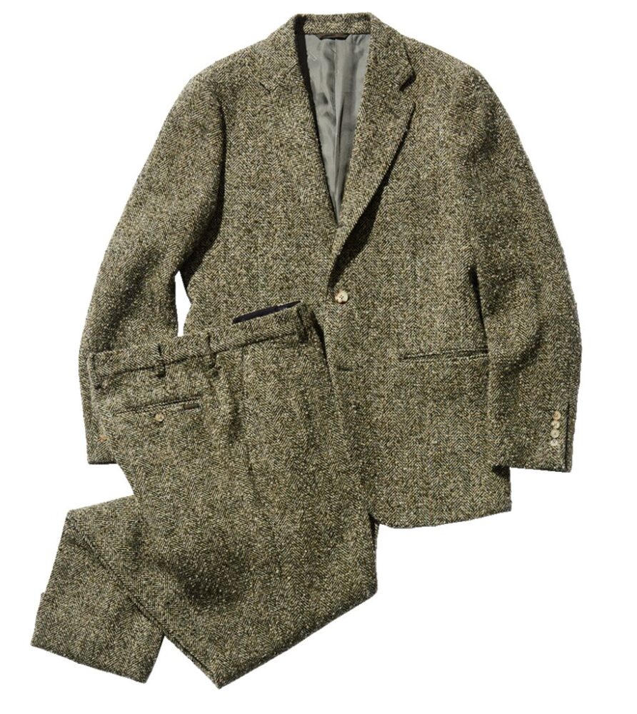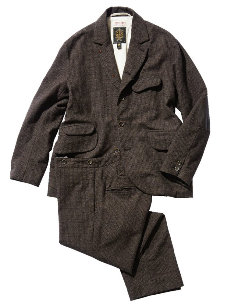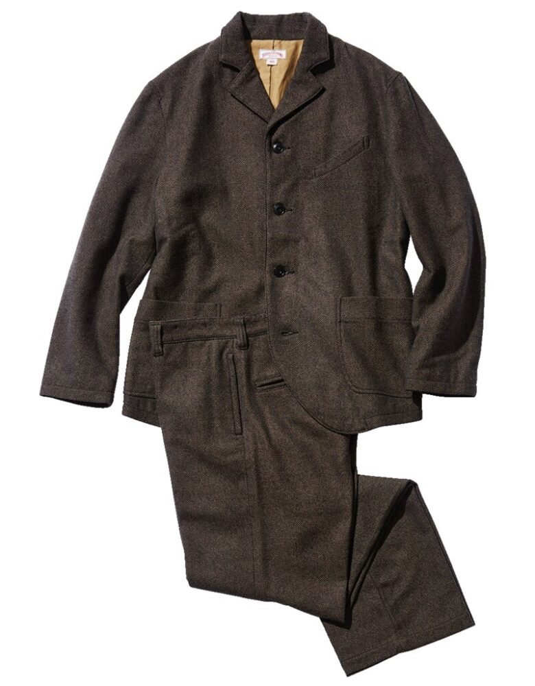 4B、小襟で狭いVゾーン、絞りのないウエストといったクラシックなサックコートデザインに濃いブラウンのネップツイード。トラウザーの脚線はパイプドステム。ジャケット7万7000円、パンツ3万9600円(ザ・リアルマッコイズ東京TEL03-6427-4300)
