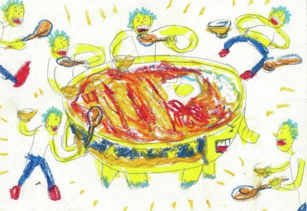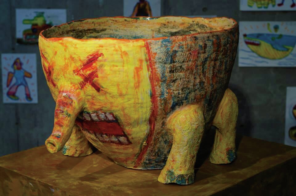 メルヘン的なイメージとしては、お腹をすかせた人にお茶碗のゾウがご飯を届けに行くんですが、工芸の文脈としてはこれは茶碗の役割を果たさないので、不能なものの象徴なんです。ゾウ自身もメタ的にそれを理解しているので、苦しそうな表情をしているし、不能のメタファーとして鼻も垂れています。