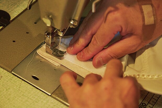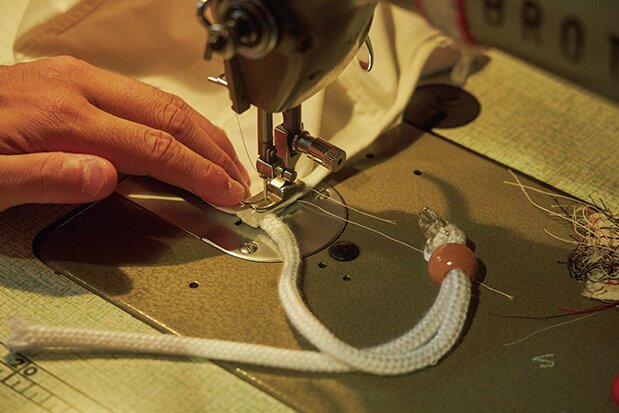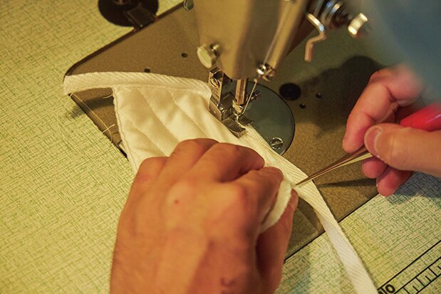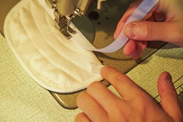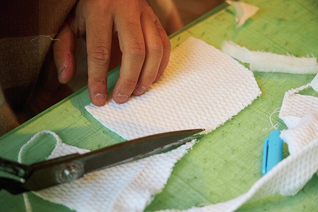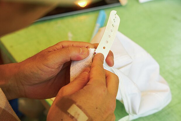 その後、耳につける生地をカットしていく。肌に触れる部分と外に見える部分で用途にあった素材を選ぶのがポイント。
