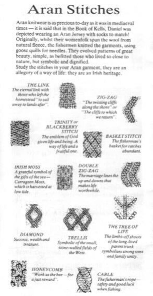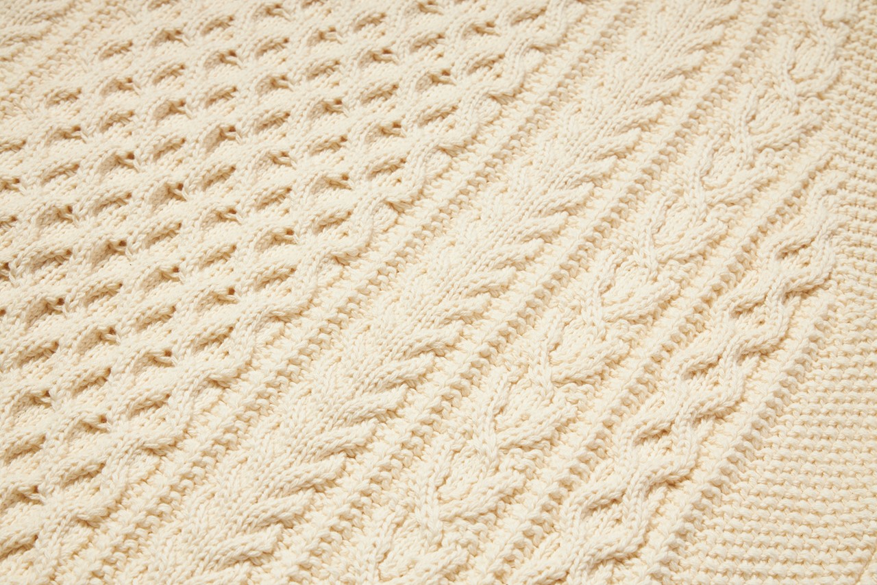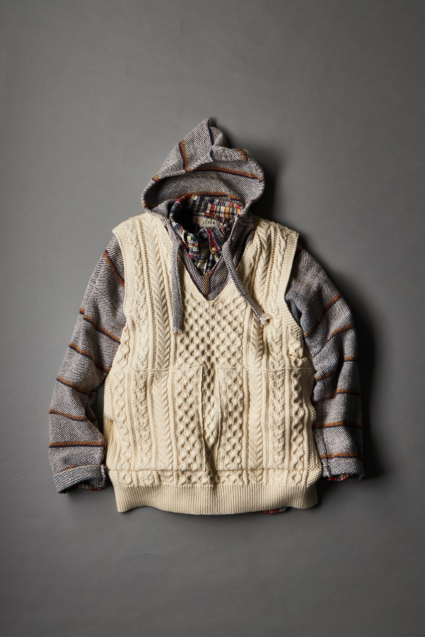 特徴である凹凸のある編み柄には、文様ひとつひとつに家紋のような役割や意味が込められているなど、さまざまな逸話を持つ。出自も含めていまだに謎多き、英国フィッシャーマンニットの代表格である。