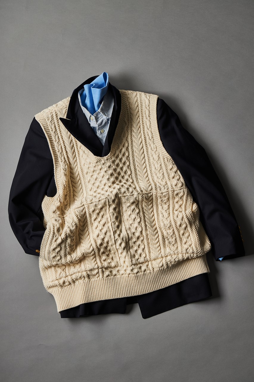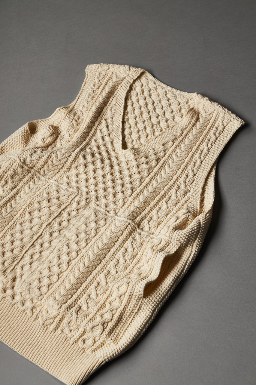 そこでこの伝統的な編み柄やデザインを活かしつつ、コットンニット素材で、春~秋にも楽しめるアイテムとして考えたのが、この「アランニットベスト」だ。