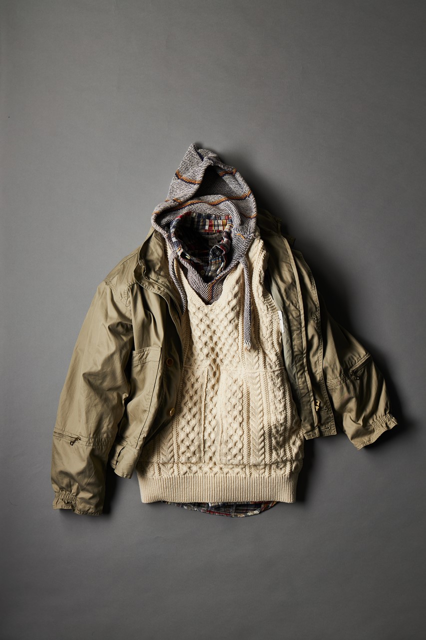 インナーには合わせるなら、ハイネックカットソー+ネルシャツやマドラスチェックシャツ+メキシカンパーカなどの王道古着がベストマッチ。上からハンティングジャケットを合わせればサファリ&トラベル、ダウンベストを合わせればクラシックアウトドアなスタイルに昇華できる。