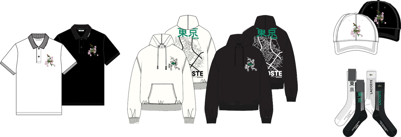 ワニロゴを、桜と原宿MAPで彩った刺繍を施した限定コレクション。ラコステのアイコンであるポロシャツをはじめ、Tシャツ、スウェット、キャップ、ソックスを販売予定。