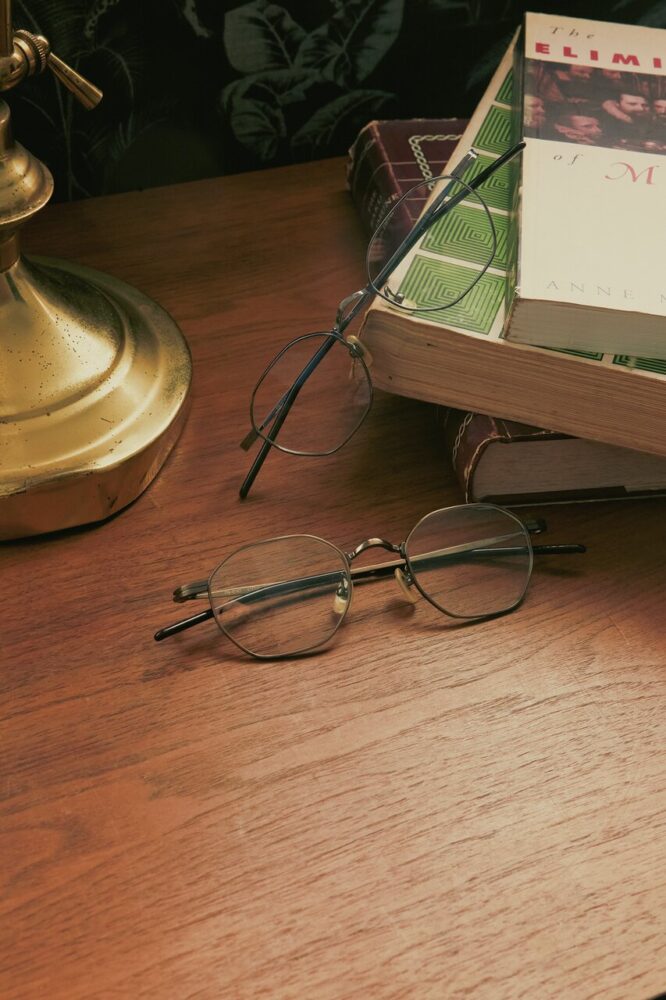 近年じわじわとトレンドになりつつあるのが、ややクセのあるメガネ。なかでも多角形のメタルフレームは、一見シンプルながらもほどよく個性を演出できるため、業界人からも注目度の高いシェイプ。チタン素材の掛け心地も快適で、ヘビロテ必至だ。3万5200円
